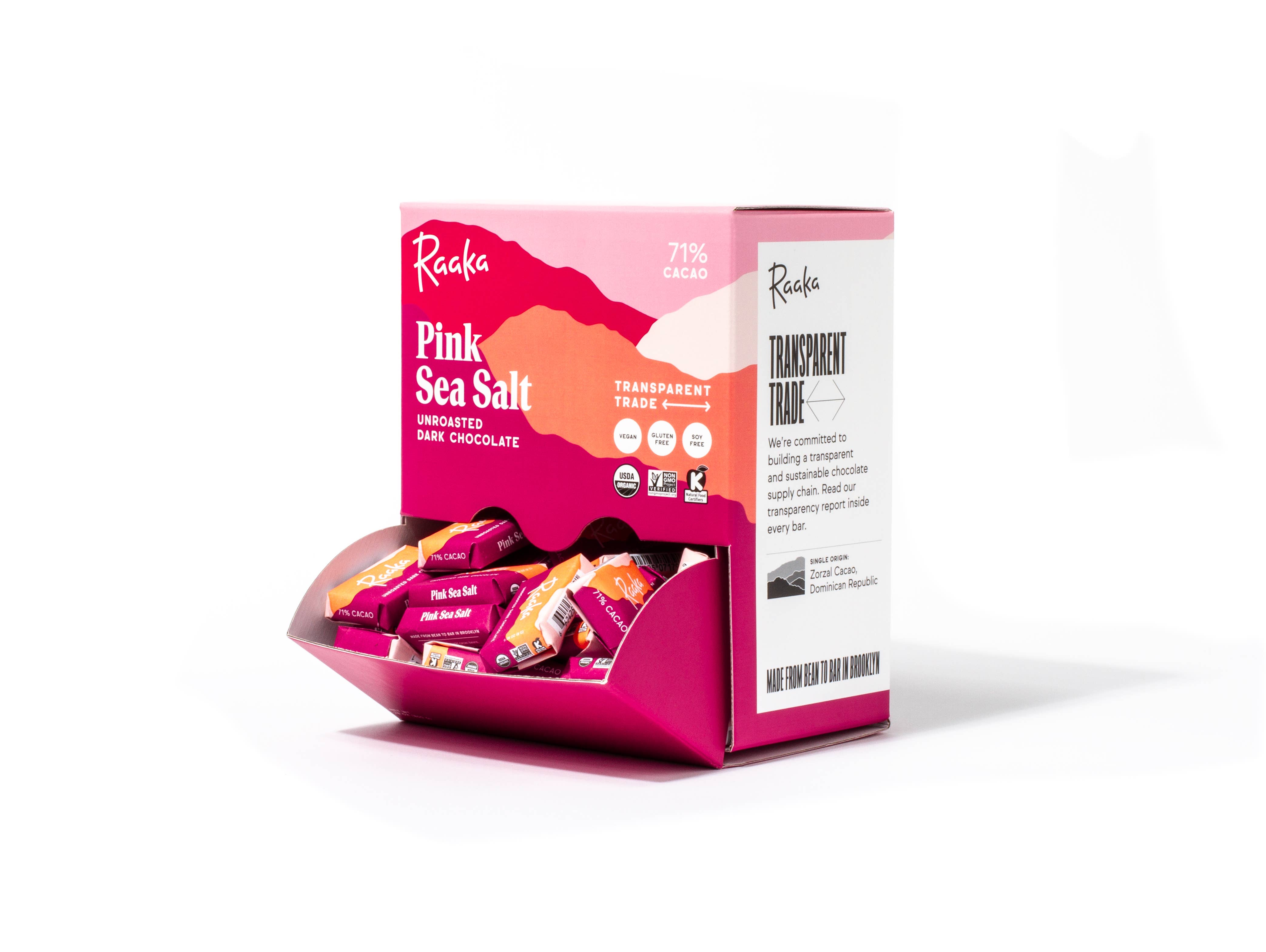 An 8 gram mini version of one of our most popular flavors! A fruity, complex salted dark chocolate to end all salted dark chocolates. Made with single origin cacao from Zorzal Cacao, and sprinkled with Peruvian pink salt sourced from Salt of The Earth Co. We think New York Magazine said it best: this bar has a “deep, dark, mysterious flavor with hints of cherry; and a finish as long as a David Foster Wallace footnote.” We're proud to use salt from Salt of the Earth Co, who sources salt from the ancient salt mines of Salinas de Maras near Cusco, Peru, and contributes a portion of proceeds back to the surrounding community. All of Raaka's chocolate is certified organic, certified kosher, vegan, soy free, gluten free, and Non-GMO and made with ethically sourced, transparently traded unroasted cacao.
