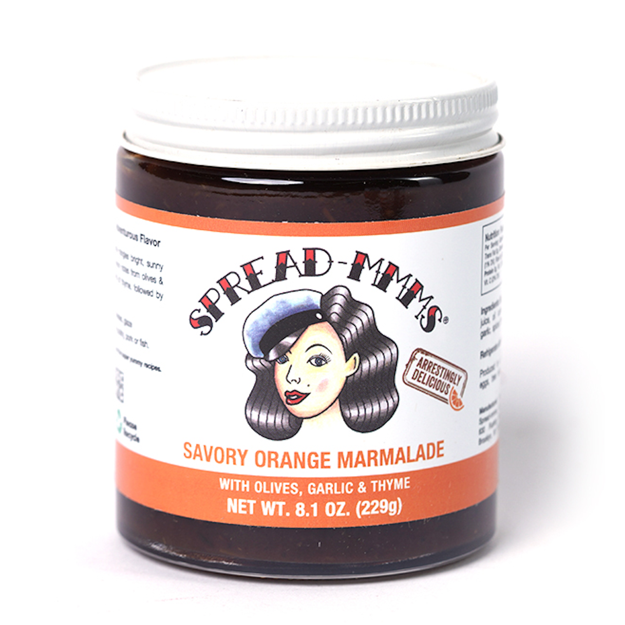 Mischievous Marmalade, a savory orange olive marmalade with garlic & thyme in a recyclable glass jar. Excellent for wine/cheese pairings. Great for gift baskets. Handmade, Plant-based/Vegan-friendly. Made in NYC. Woman Owned Business. 1% for the Planet. Storage: Shelf stable, refrigerate after opening.