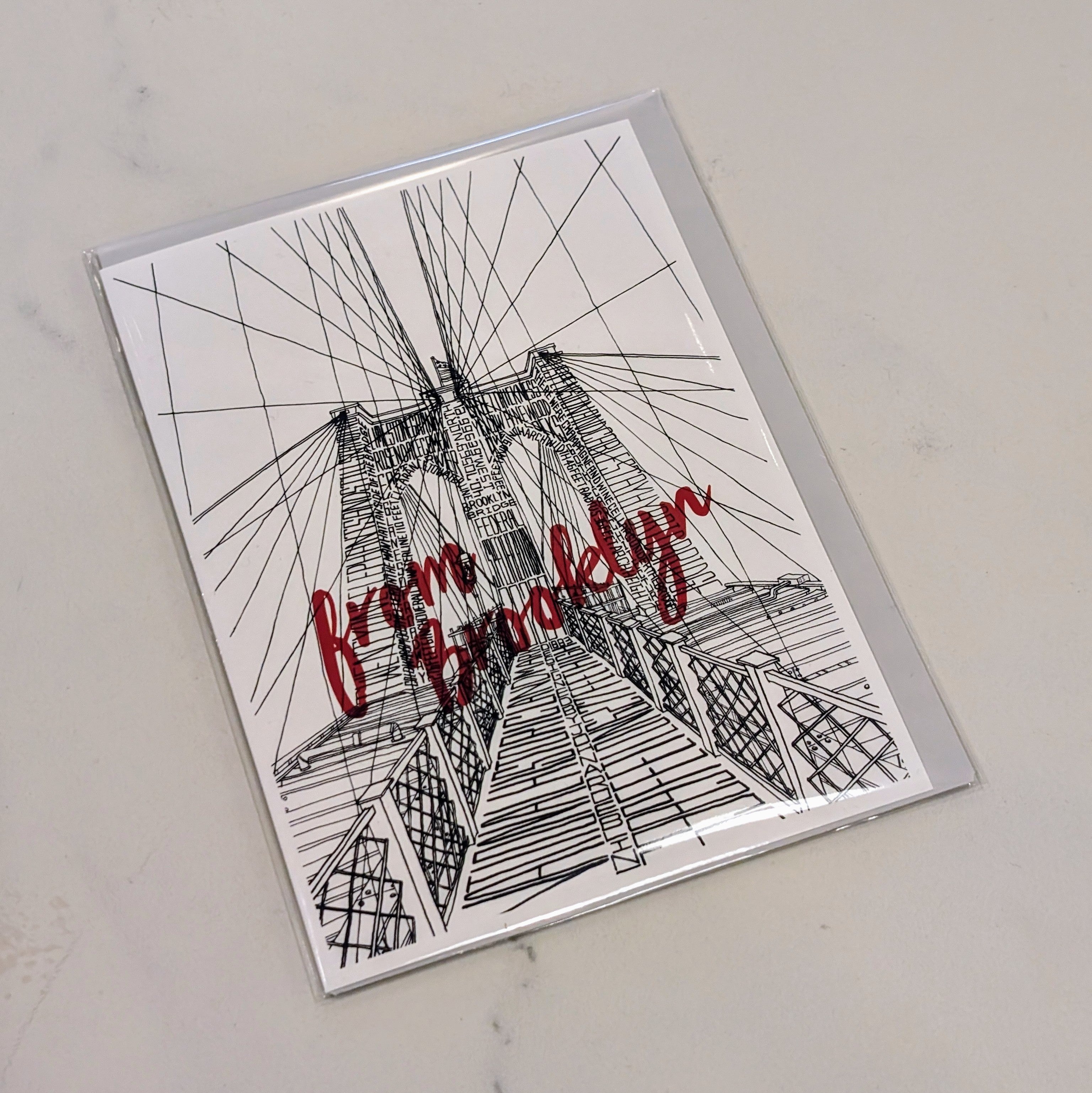 Celebrate the wonder and strength of the Brooklyn Bridge with our architectural greeting card. Perfect for any occasion, this 4 x 6 card features a unique design and a touch of NYC flair. Share the love for this iconic landmark with your friends and family. (Bridge the gap between cards and gifts!)
