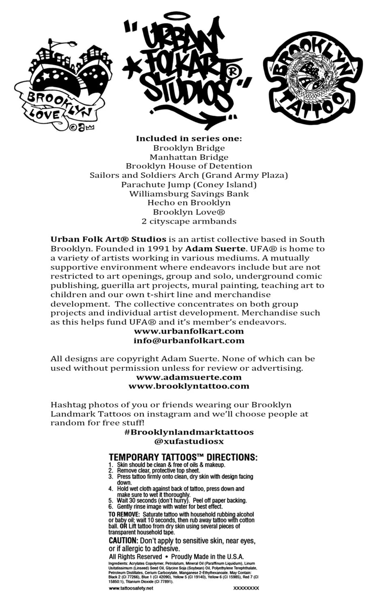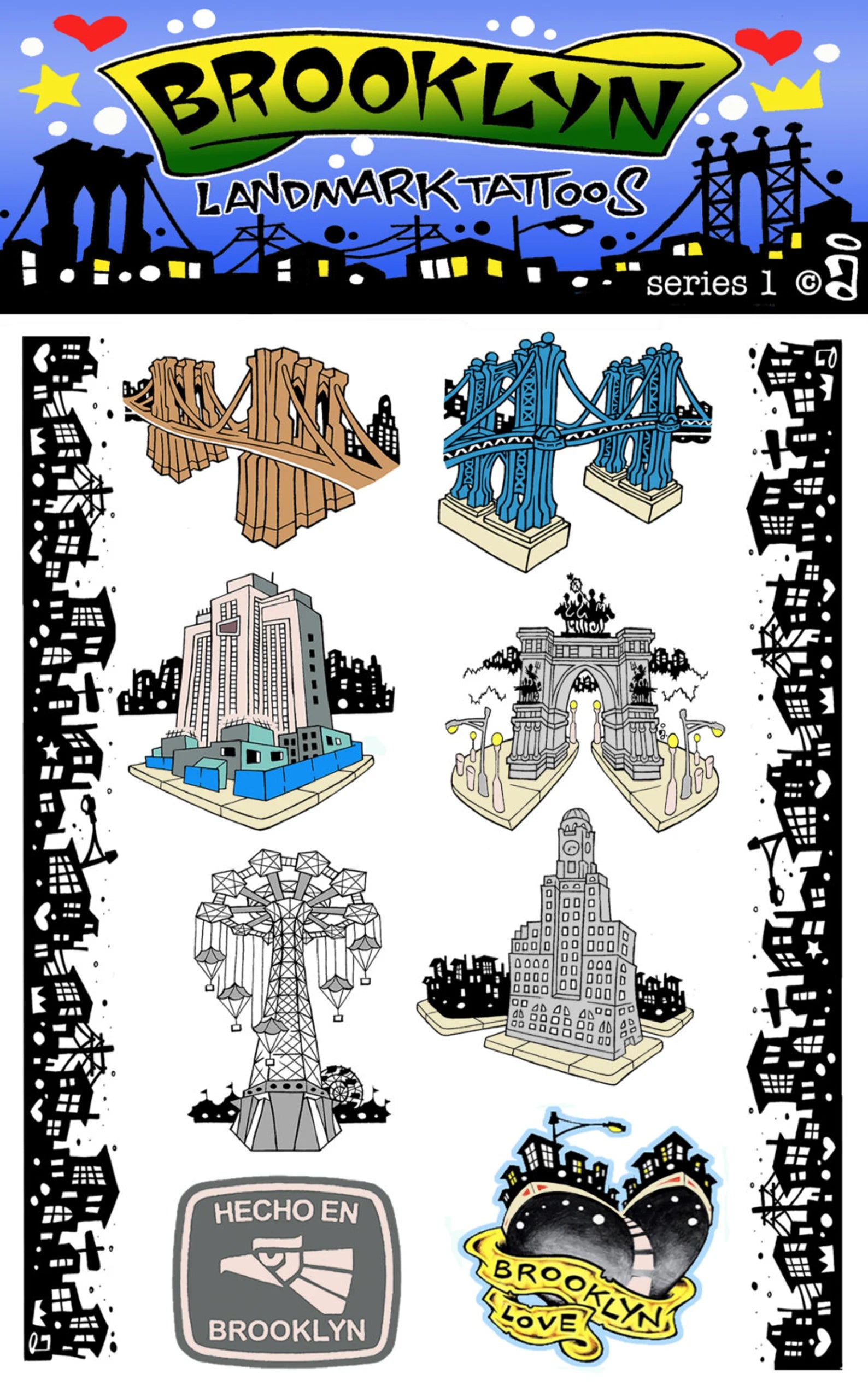 Get inked with some Brooklyn charm! Each sheet of these temporary tattoos, designed by Adam Suerte, includes 8 individual Brooklyn landmark designs and 2 cityscape arm and leg bands for a bold and unique look.