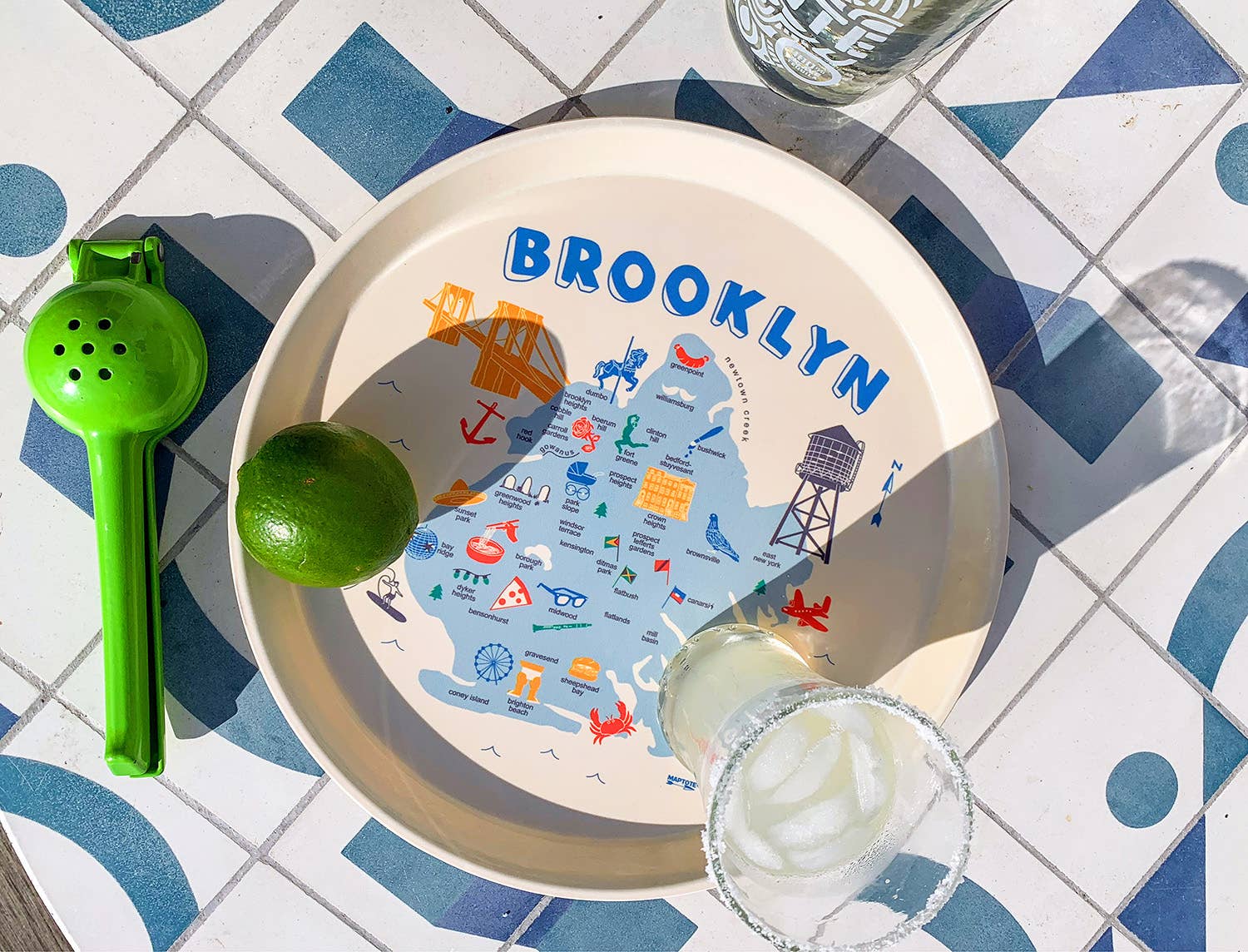 This tray is perfect for serving drinks and appetizers. It also makes a great decoration for your home, with a vintage feel that will transport you to Brooklyn, New York. Measuring at about 12" in diameter, this tray is dishwasher safe and made of lightweight but durable fiberglass. Designed in Brooklyn, NY and made in the USA.