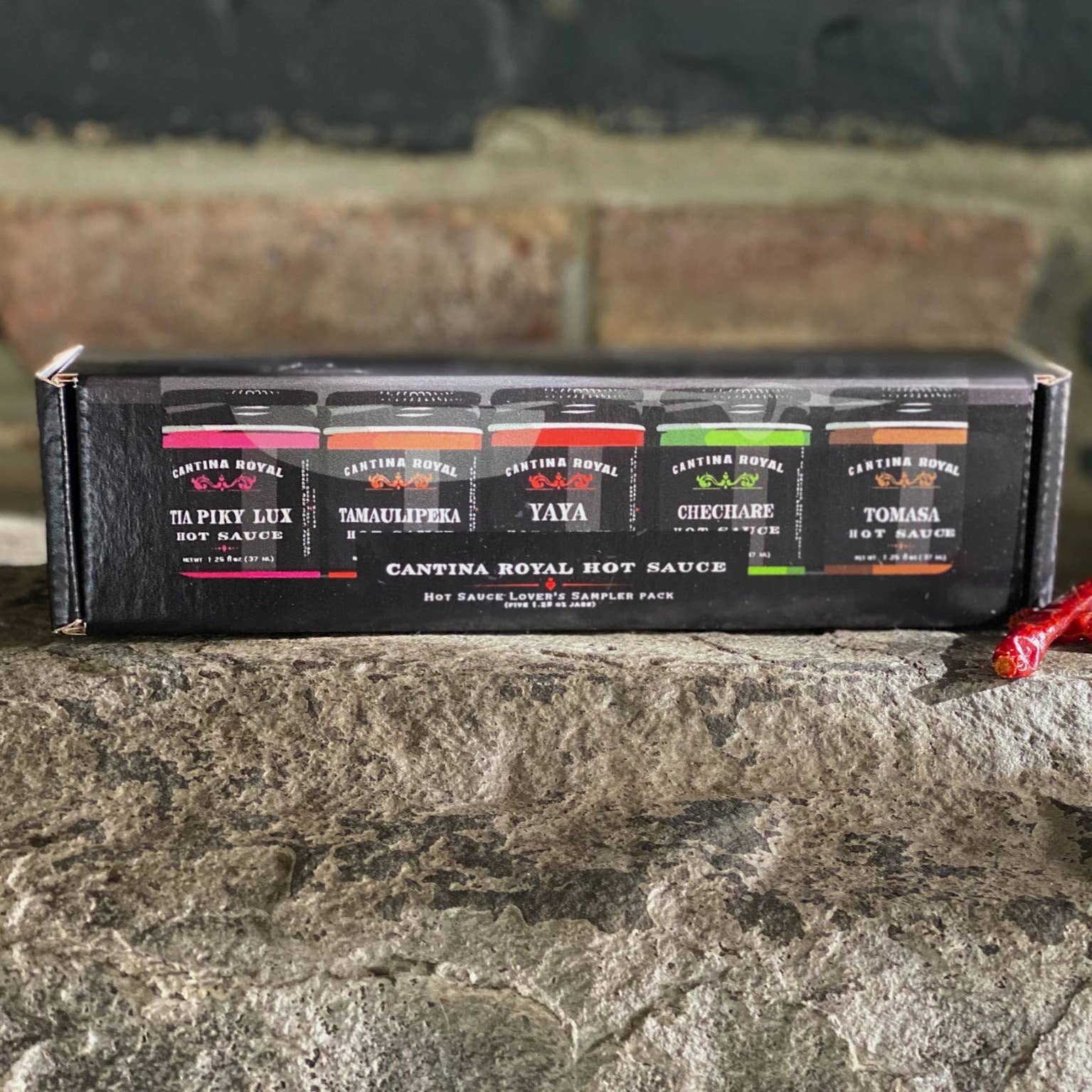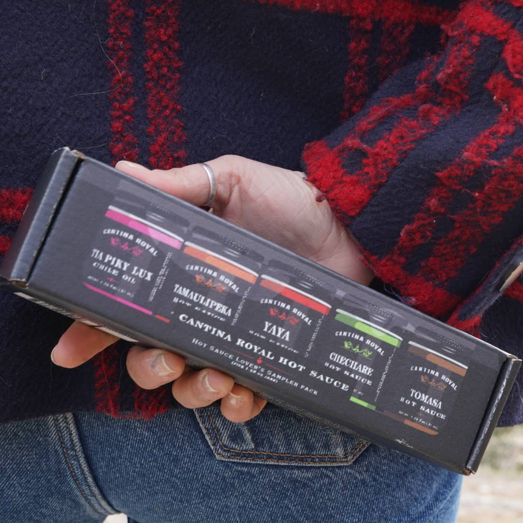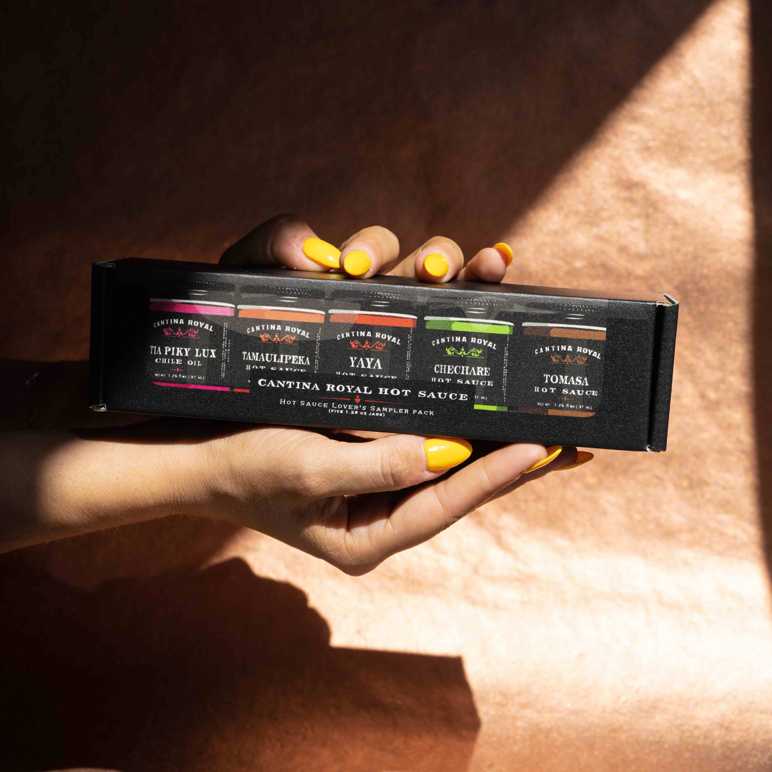 Get ready to spice up your life with Cantina Royal's Hot Sauce Lover Gift Pack! This pack includes five 1.25 oz jars of assorted flavors, all TSA approved and perfect for on-the-go travel. Each jar is filled with inspired combinations of fresh and dried Mexican chili peppers, including the classic Jalapeño, fiery Habanero, and aromatic Manzano. But don't worry, these sauces are not only delicious, but also vegan, gluten-free, and top 8 allergen-free. Say YAYA to the new classic Arbol Chile Hot Sauce, indulge in the warm and toasty flavors of Tia Piky Lux, try the multifaceted and complex Tamaulipeka with tamarind and smoky chiles, add a bright and zingy kick to your dishes with Chechare, and experience the dark and smoky umami of Tomasa. All of this comes in a beautifully branded gift box, making it the perfect gift for