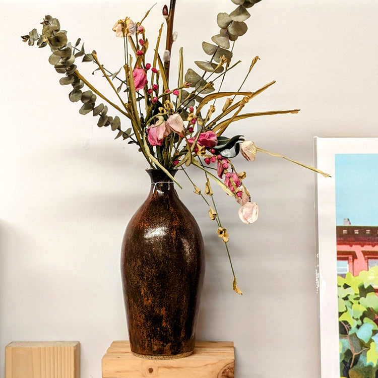 Indulge in the sophistication of this Ceramic Bottle, hand thrown on a potters wheel and glazed with a luxurious metallic finish. Perfect for displaying a single stem or a small bouquet of eucalyptus, this bottle exudes elegance and refinement. Elevate any space with this exclusive piece of art by Cem Kocyildirim.