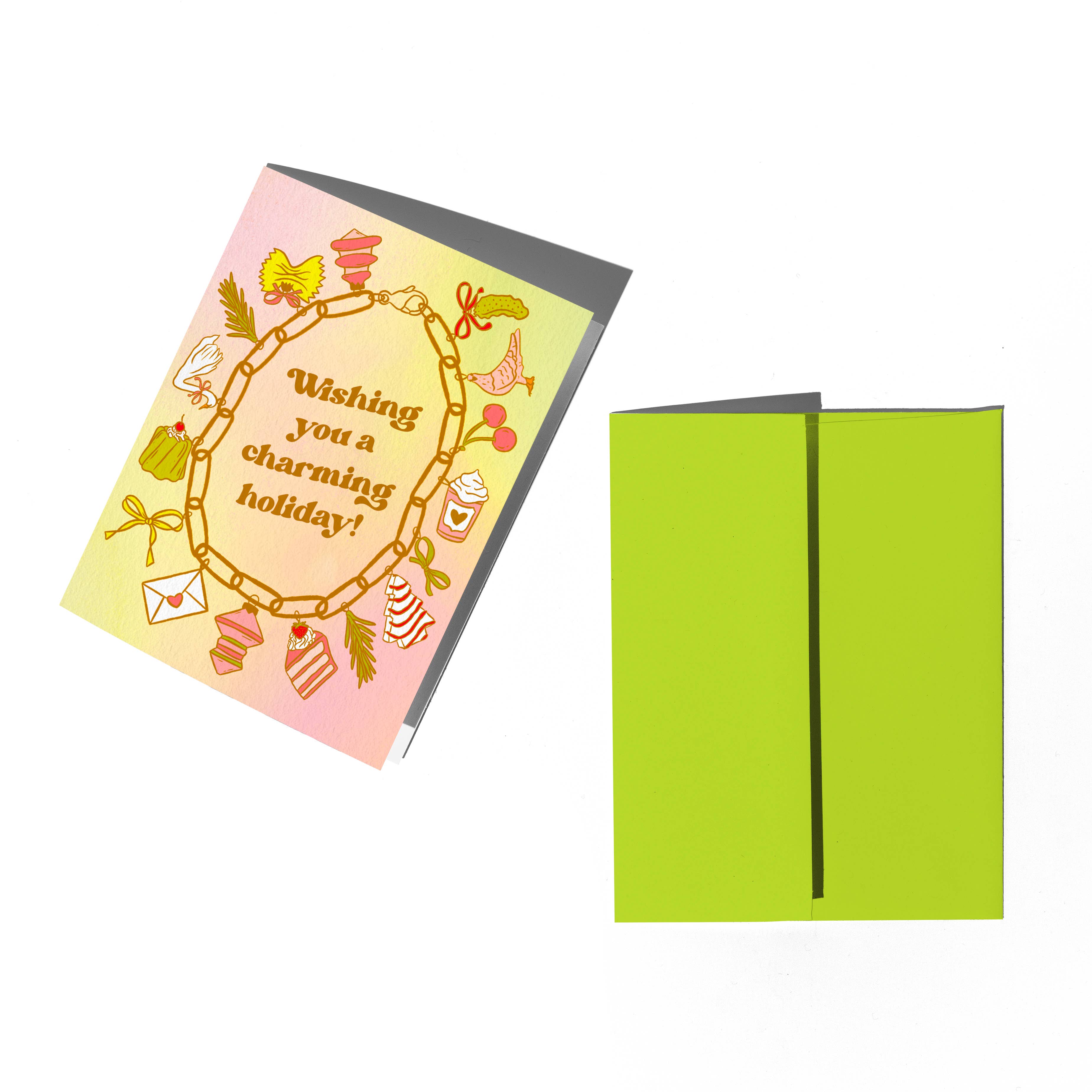 Card reads: "Wishing You A Charming Holiday" and features an illustrated charm bracelet including pasta, jello, cake, coffee, birds and more.