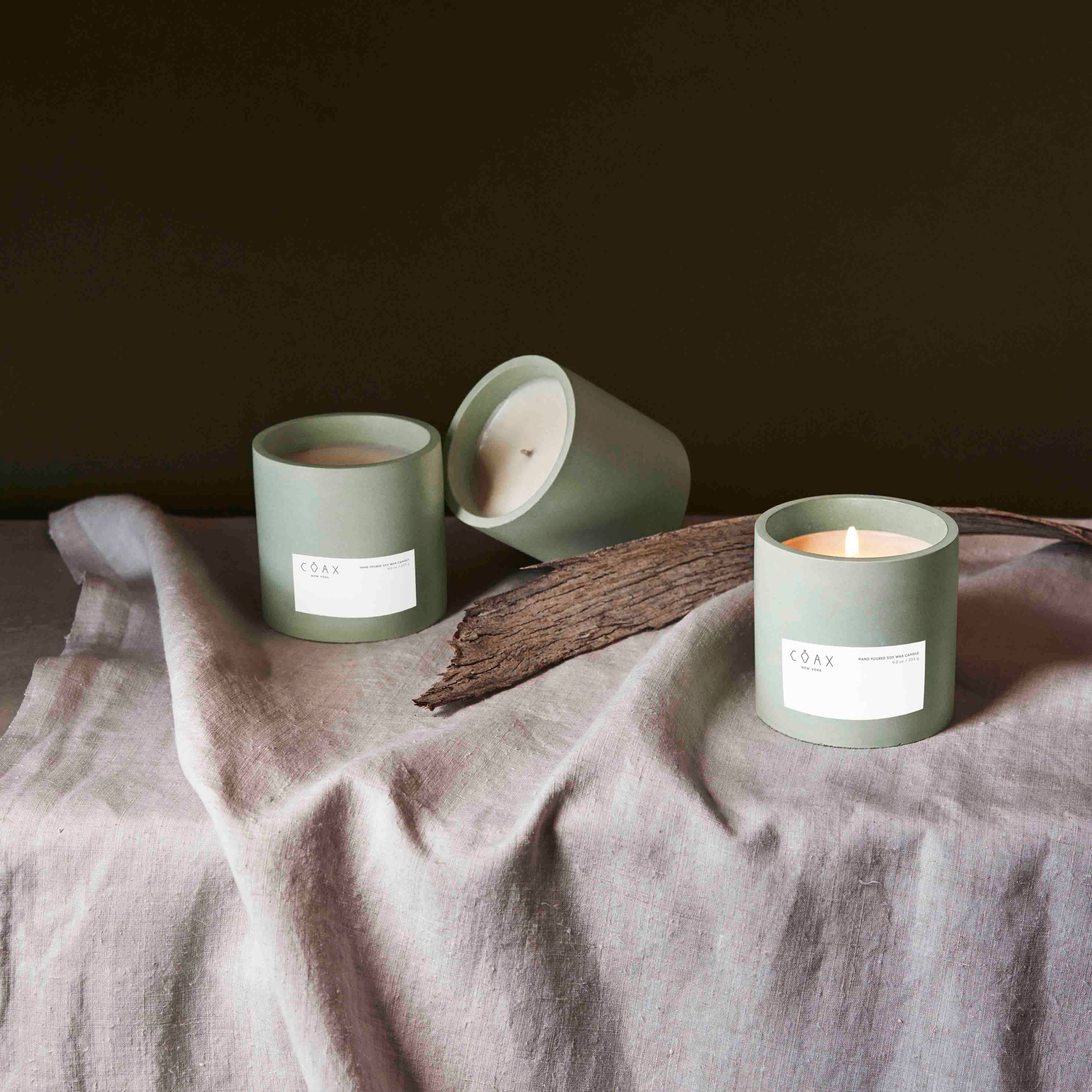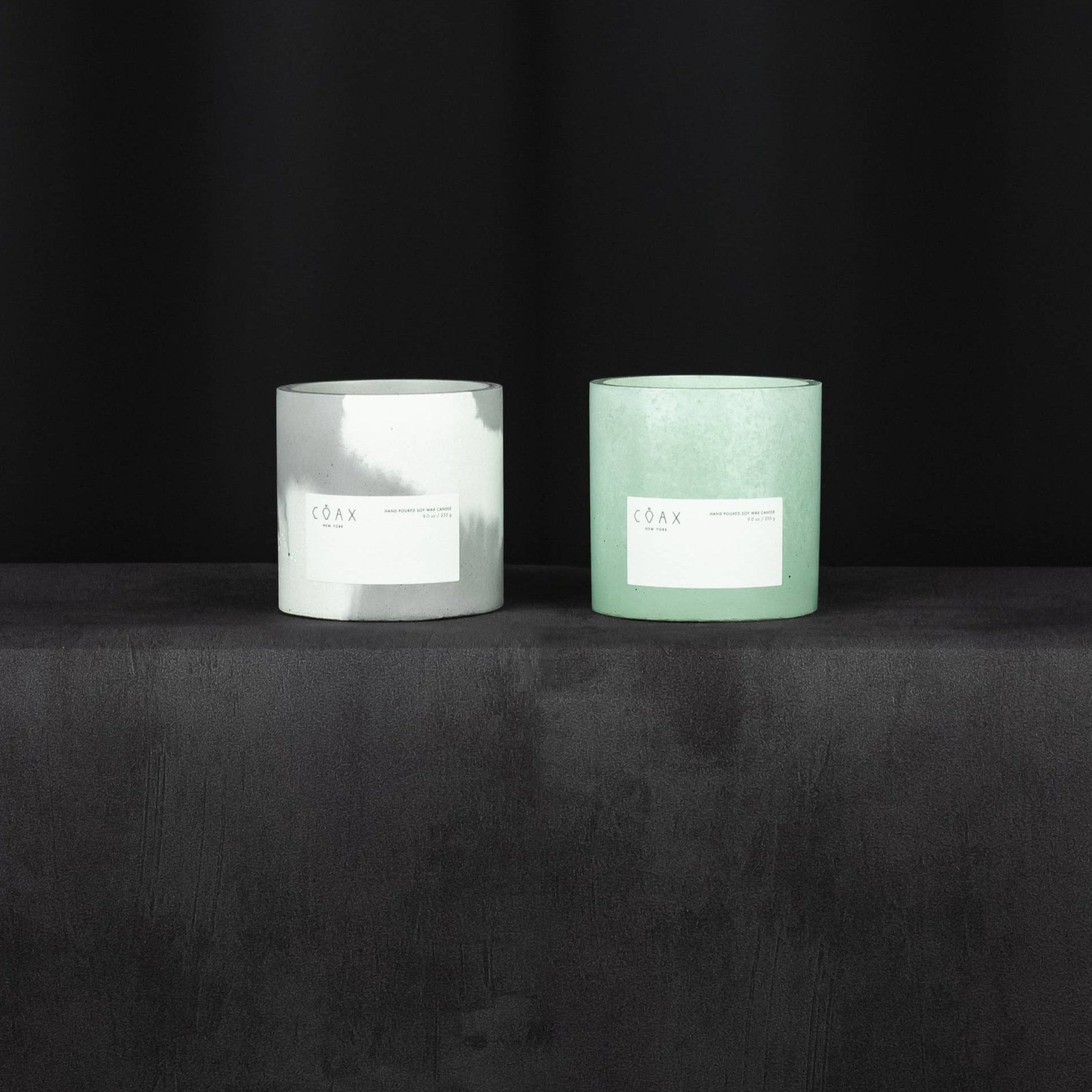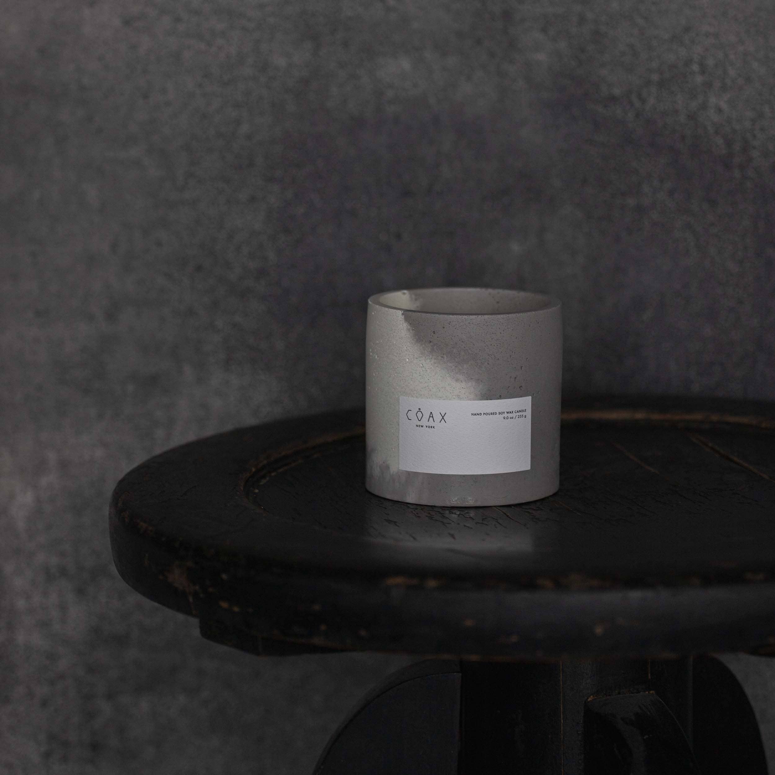 [BAC] Birch / Amber / Coffee (woodsy, luscious, roasted) [WCP] White Birch / Coconut / Palo Santo (woodsy, light, refreshing). These new Coax cement candles are hand poured and hand crafted with 100% natural soy wax. The vessel has a raw, mid-century aesthetic, each vessel has its unique, one of a kind shade and pattern. All Coax products are handcrafted in small batches in Brooklyn, New York. Specification: 9.0 oz / 255 g plant based soy wax handmade cement vessel est. burn time 55 hours