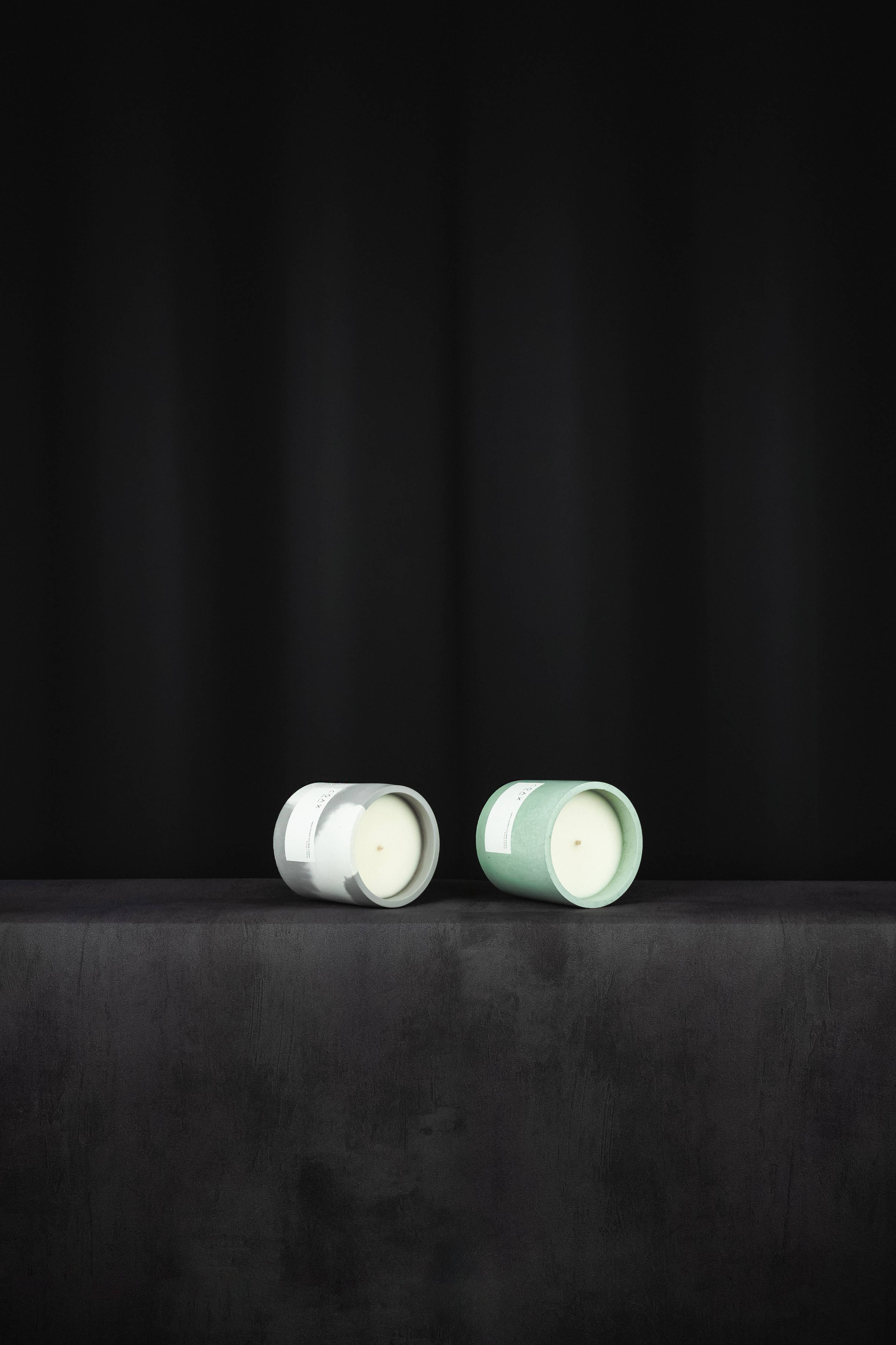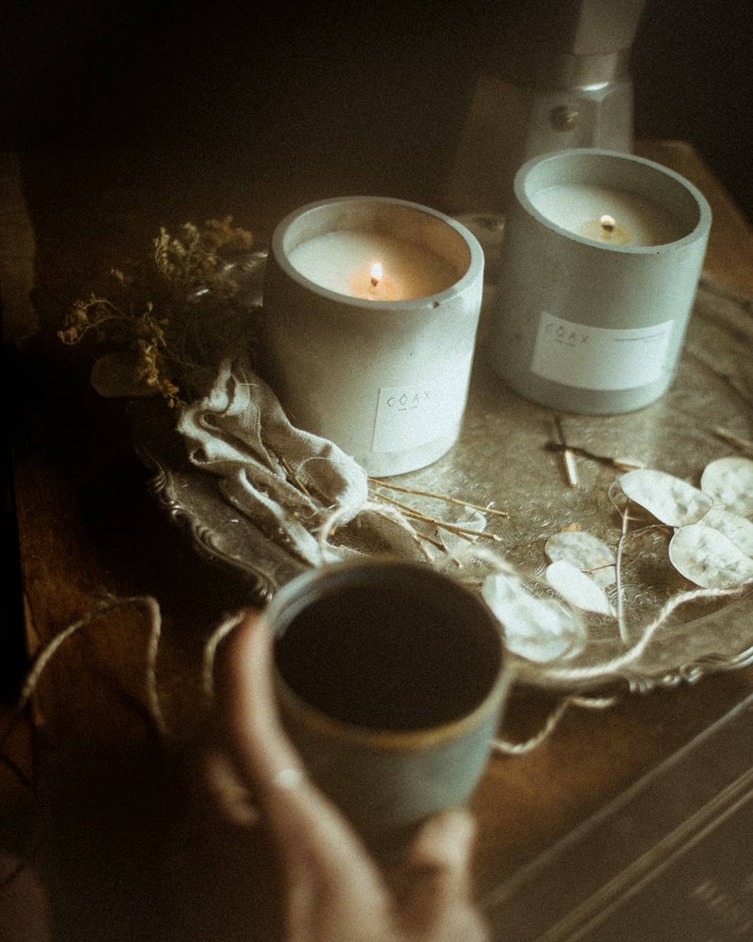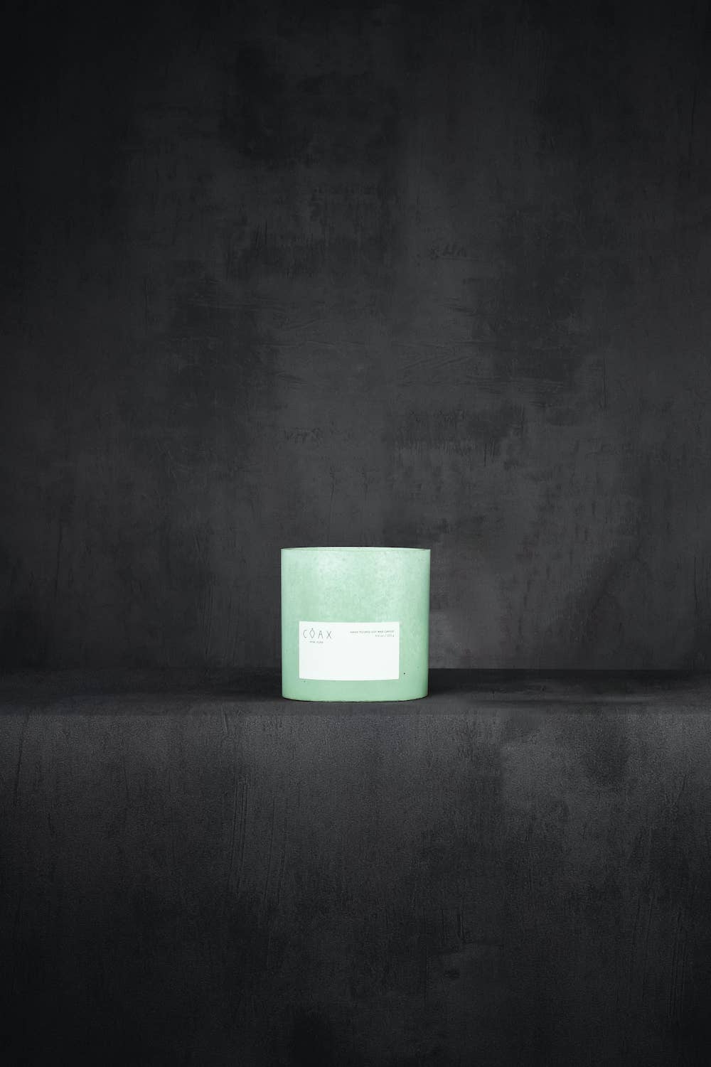 [BAC] Birch / Amber / Coffee (woodsy, luscious, roasted) [WCP] White Birch / Coconut / Palo Santo (woodsy, light, refreshing). These new Coax cement candles are hand poured and hand crafted with 100% natural soy wax. The vessel has a raw, mid-century aesthetic, each vessel has its unique, one of a kind shade and pattern. All Coax products are handcrafted in small batches in Brooklyn, New York. Specification: 9.0 oz / 255 g plant based soy wax handmade cement vessel est. burn time 55 hours