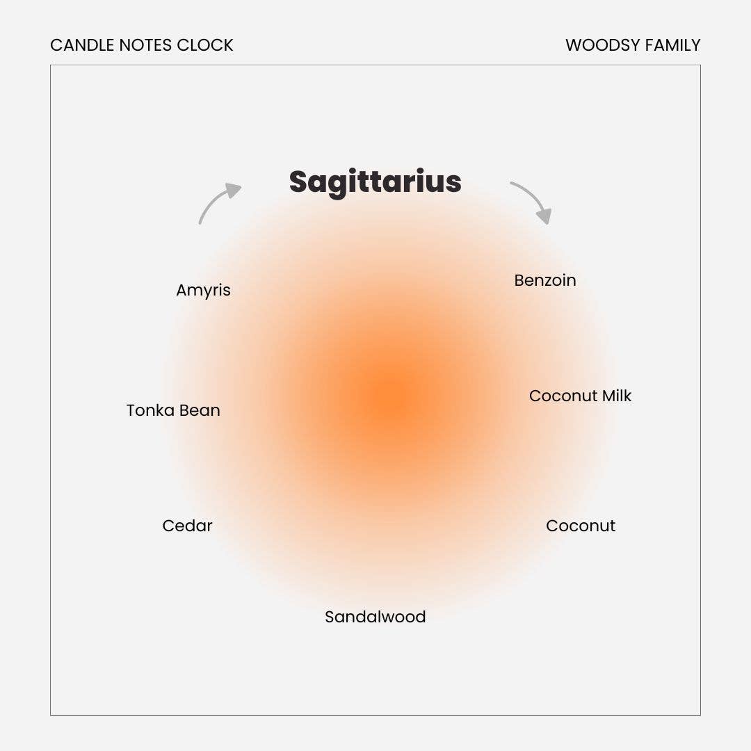 Sagittarius: November 22nd - December 21st. It's all about the journey and never the destination. Enjoy fragrance notes of coconut milk, cedar, santal, tonka bean and amyris. A perfect birthday gift for the Sagittarius in your life - or if you enjoy sweet sophisticated scents. All of our soy candles are handmade in small batches in Bushwick Brooklyn. Our high-quality vegan formulas allow for a slow clean burning experience. All candles have curated Spotify playlists and mocktail recipes. Made with 100% natural soy wax, cotton wicks, and toxic- free fragrance blends. NO phthalates, parabens, sulfates, synthetic dyes, or plastics.