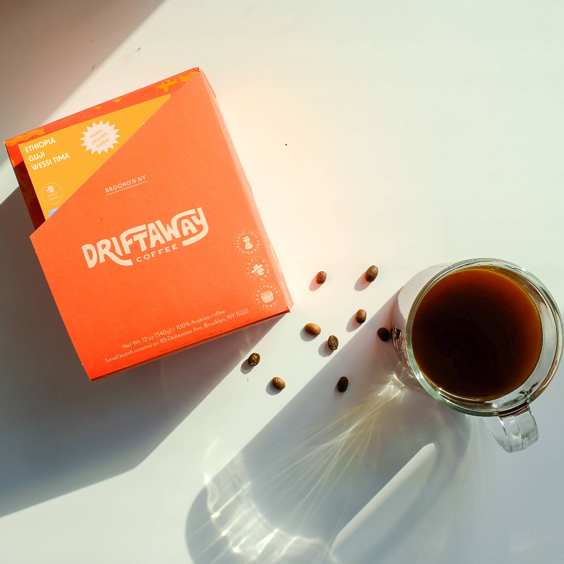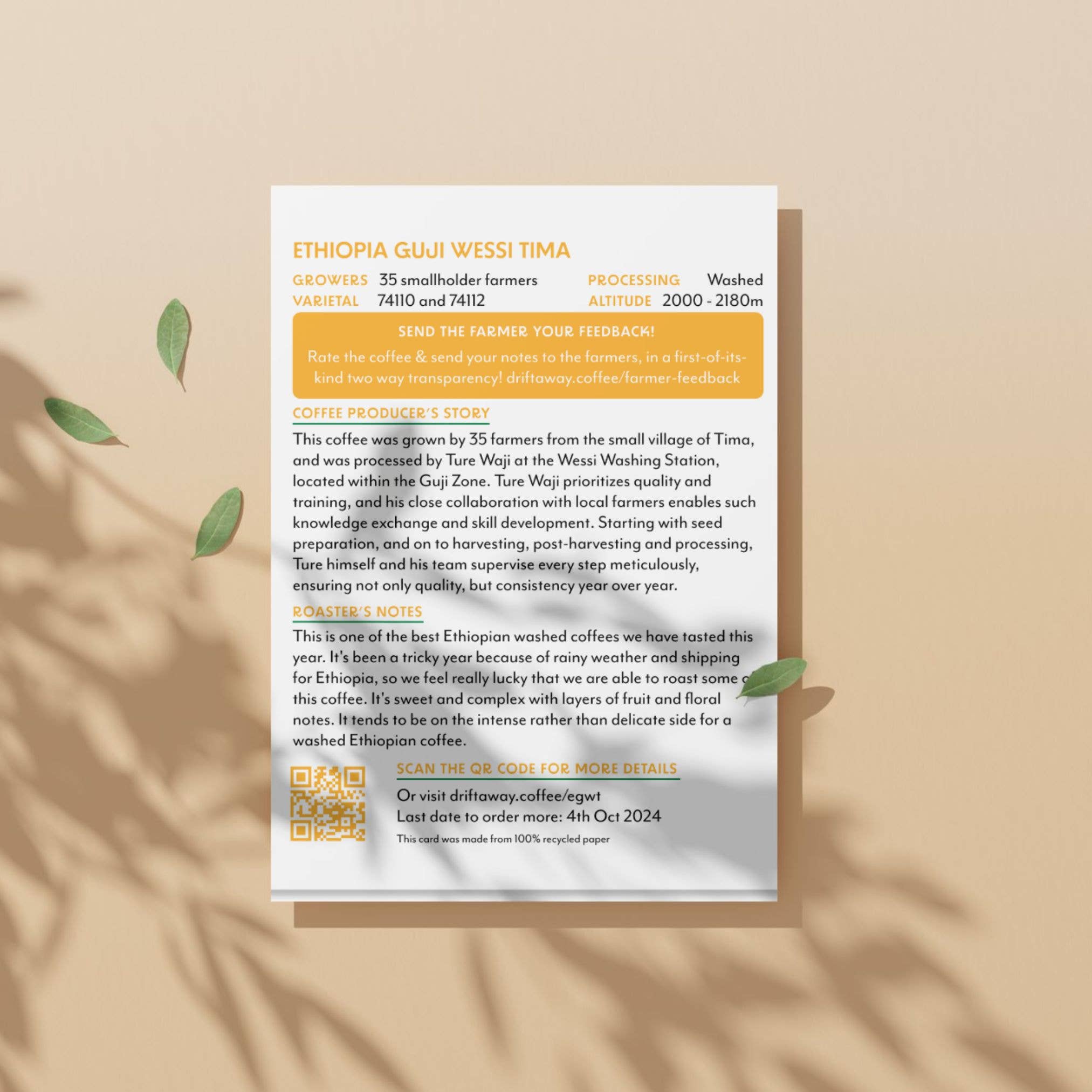 A light roasted coffee from small holders in Ethiopia with tasting notes of floral, orange and pineapple. Comes with a postcard telling the story behind the coffee - from where it's grown to how we roasted it. Fair & transparent farmer prices, paying 3-5x Fair Trade prices. Plastic-free packaging, with compostable bags and recycled material. Carbon-neutral operations. Every bag contributes to the World Coffee Research.