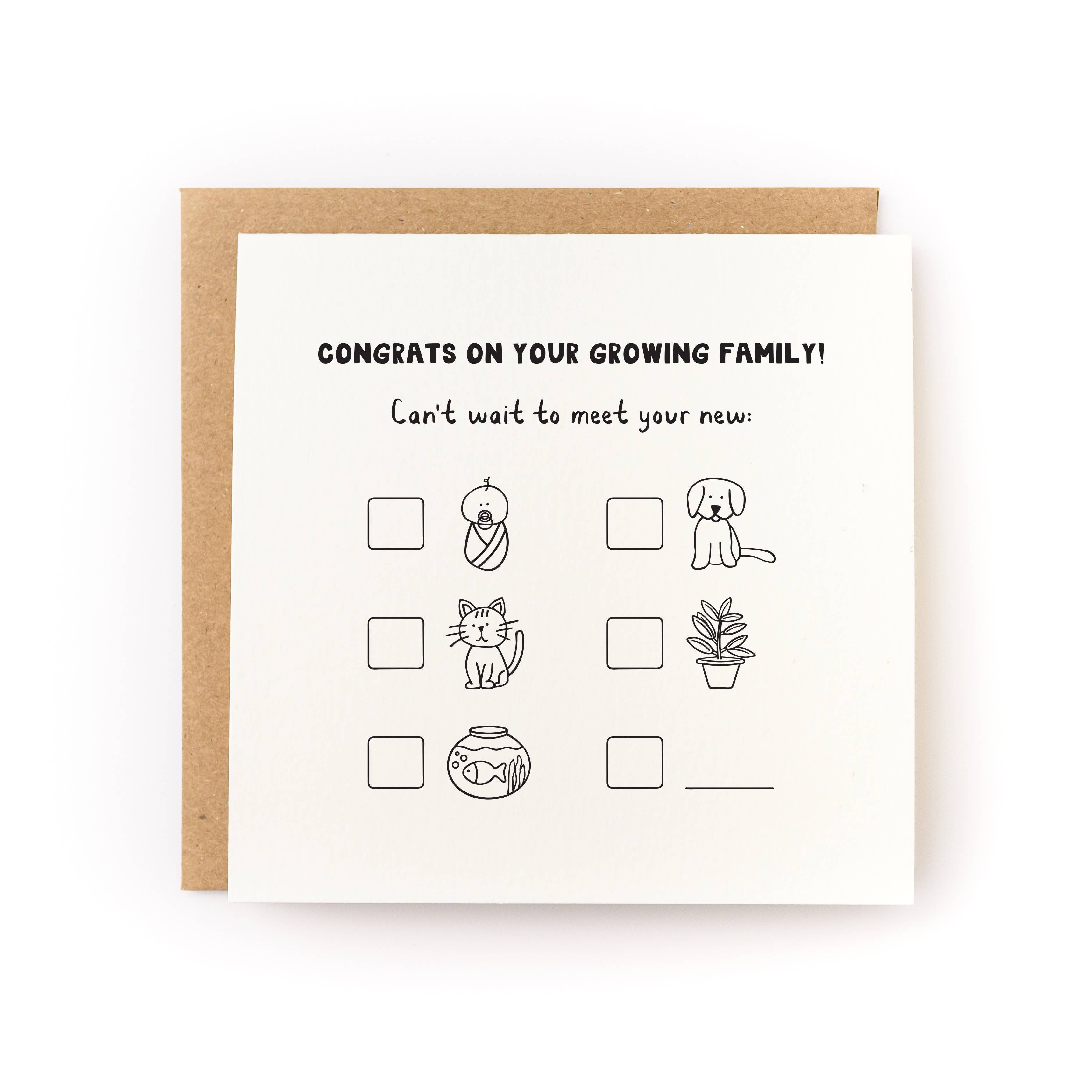 Commence the celebration of a cherished new family member with this irresistibly cute card, suitable for any expanding family unit, whether it's a tiny human, furry friend, or leafy companion! 4.75" x 4.75" of folded card space A blank interior Letterpressed on luxe, delicate white cardstock Coupled with a repurposed Kraft envelope Meticulously hand-printed on an antique letterpress machine in lively Brooklyn, New York. Due to this completely hands-on printing process, there may be slight variations from print to print, making each card truly one-of-a-kind. Postage-wise, square envelopes may require extra stamps.