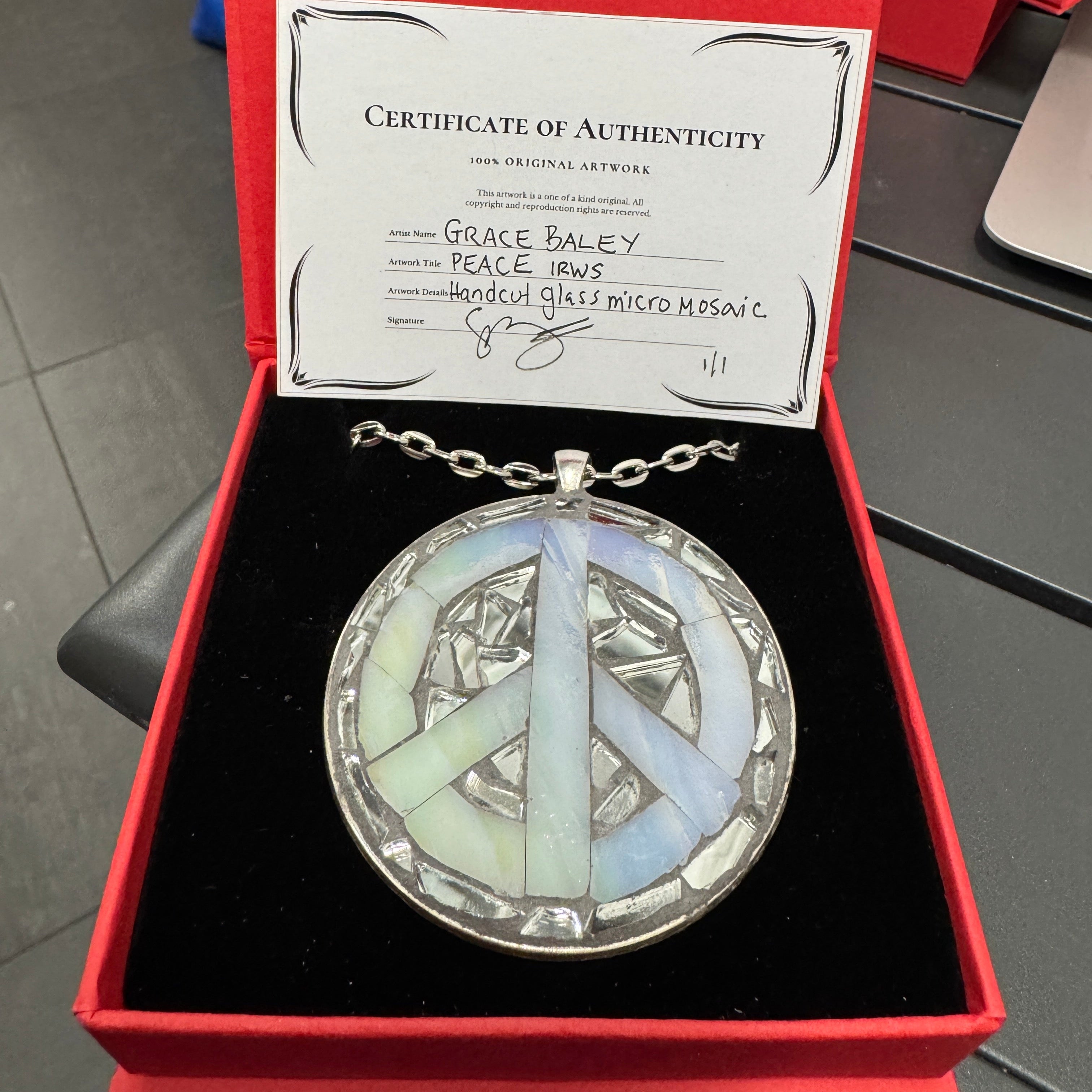 Hand cut glass micro mosaic on 2.2” Alloyed metal pendant in antique bronze with 24" iron link chain in antique bronze or 2.2” Alloyed metal pendant in antique silver with 24" iron link chain in silver