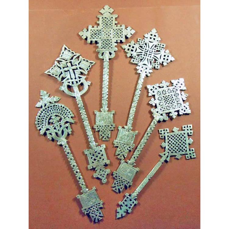 The classic handkerchief design is recreated in this bandana with Meskel (Orthodox Cross) and Angel motifs, 2 of the most recognizable icons in Ethiopian and Eritrean art. The inspiration images at the end show angel paintings on the walls of a centuries-old church in Gondar, Ethiopia, and assorted processional Meskel crosses. 21” x 21”; Digitally printed on a lightweight 100% GOTS certified cotton with a soft, breezy drape.