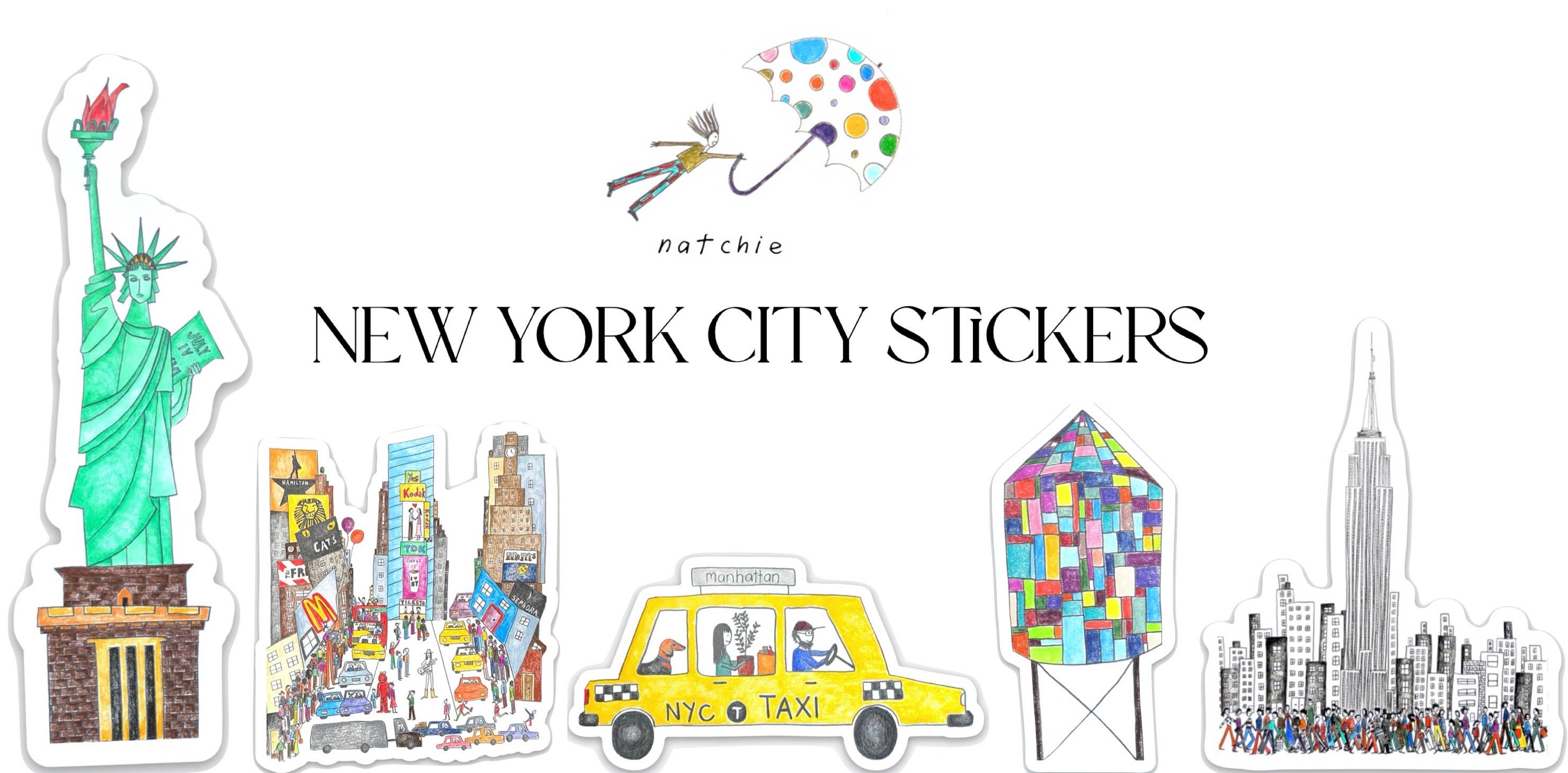 5 water proof vinyl New York City Themed stickers: Tom Fruin Water Tower, Empire State Building, Times Square, The Statue of Liberty & Uptown Taxi.