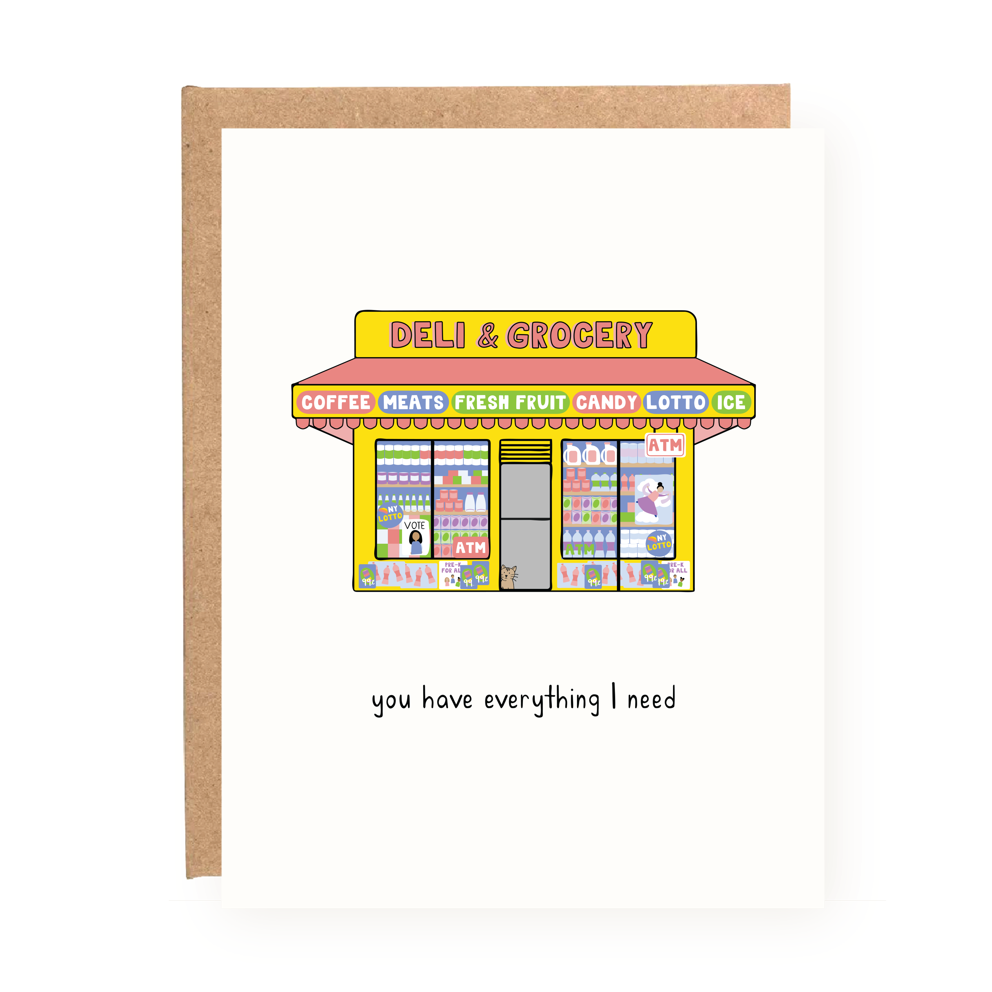 A funny, sweet love card for New Yorkers that's a loving nod to the city's bodegas - A2 folded card - Blank inside - Printed on thick soft white cardstock - Paired with a recycled kraft envelope and open cello sleeve - Printed by a family-owned business in Maryland Kwohtations is proudly a woman-owned and AAPI-owned small business, and inclusivity is at the core of everything we create.
