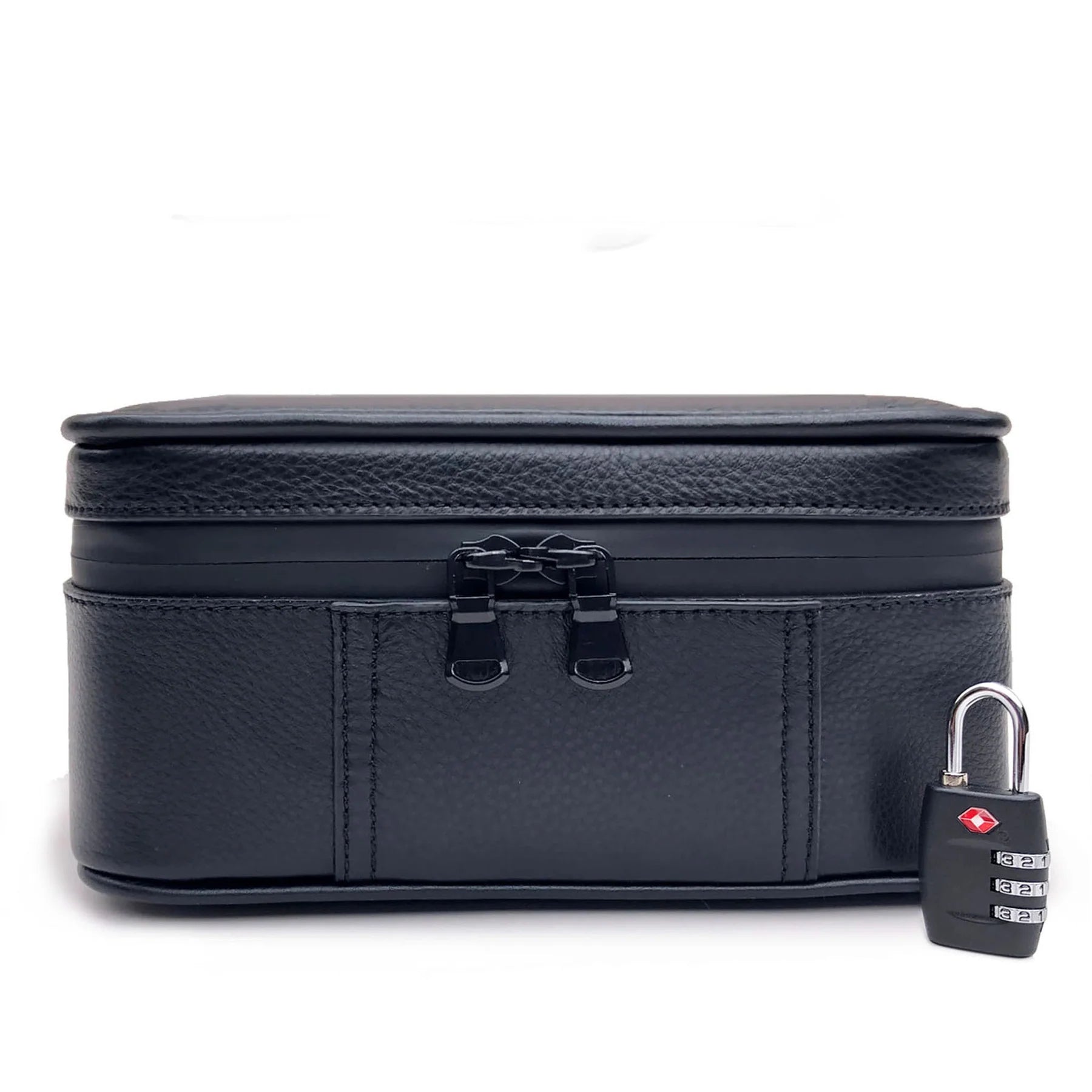 This smell proof Caddy is the perfect odor-proof storage solution for your stash and accessories crafted with supple top-grain leather. It has our proven 5-layer odor-proof technology, a padded interior and combination lock. The interior partitions can be adjusted to fit a variety of sized items. It can be used as odor proof weed storage or a great travel toiletry case with security.