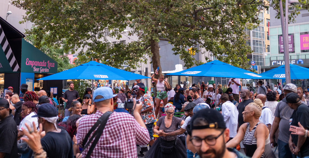 A vibrant crowd dances together at Vinyl Nights under bright blue umbrellas at Albee Square, Downtown Brooklyn, on August 15th, 2024. In the center, the same stylish dancer in a black tutu skirt and graphic tee spins joyfully while surrounded by a diverse group moving to the DJ’s beats. A woman in floral shorts stands on a bench in the background, hyping up the crowd. Strings of lights and the “Empanada Loca Beer Garden” sign add to the festive summer vibe as people of all ages fill the street, clapping, cheering, and grooving together.