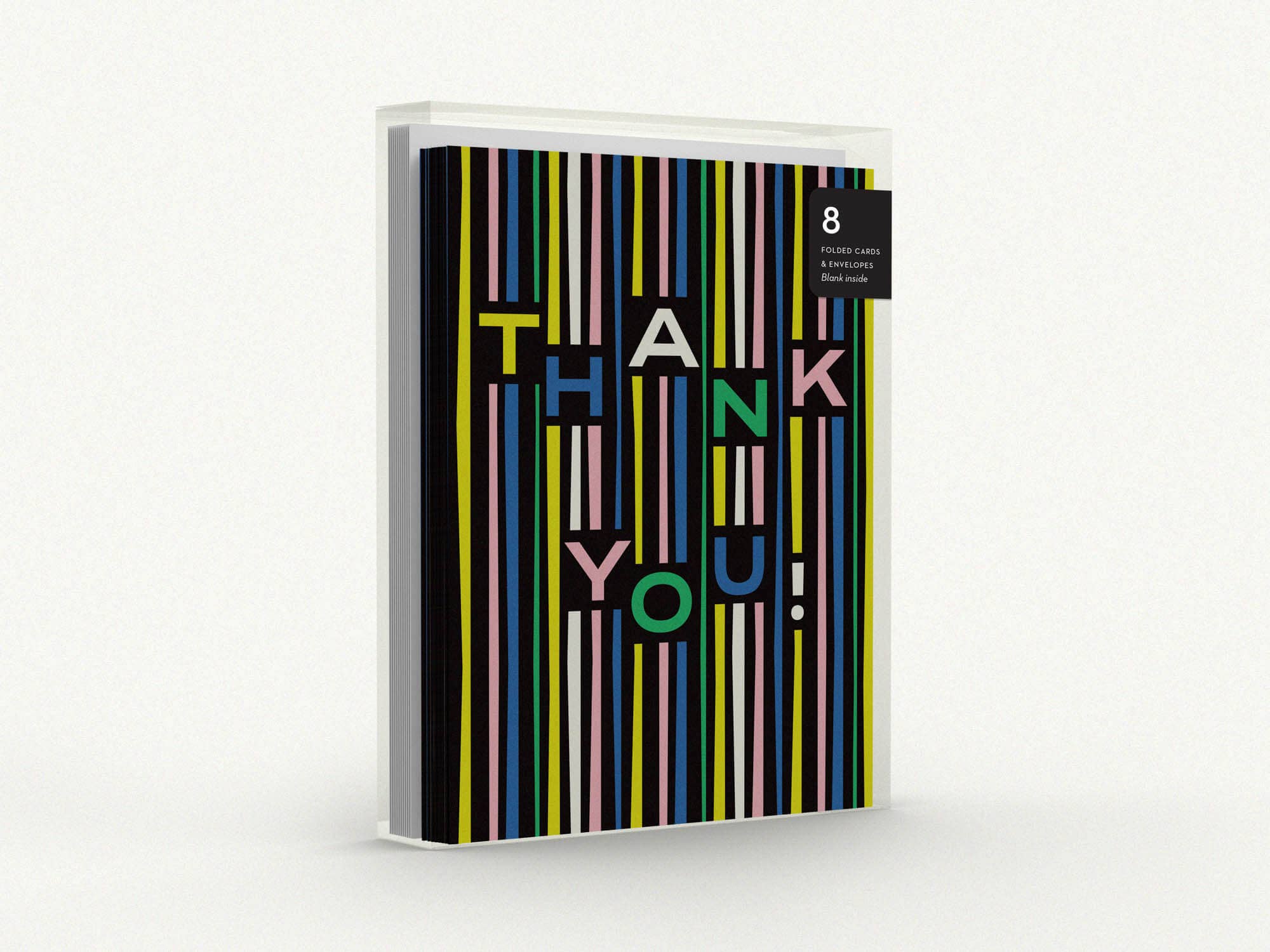 Thank you card with bold typography and abstract party streamers pattern. • blank inside. • A2 (4.25" x 5.5"). • 100# FSC-certified paper. • comes with a color-coordinated envelope. • packaged in a protective cellophane sleeve or clear box. • flat-printed. • printed in the USA.