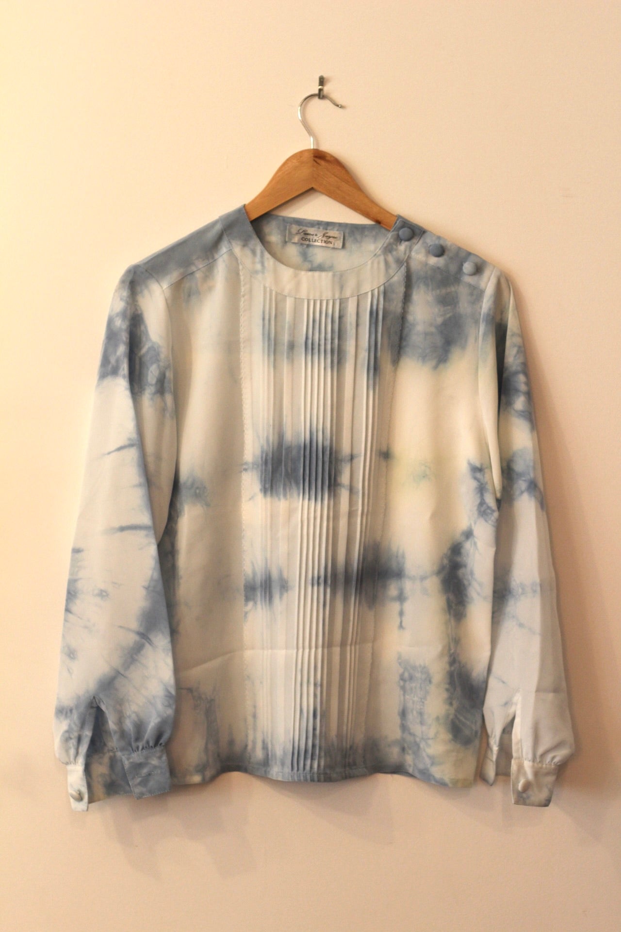 A silky vintage gem, shibori-dyed with Astrogurl flair. This long sleeve blouse is both timeless and electric.