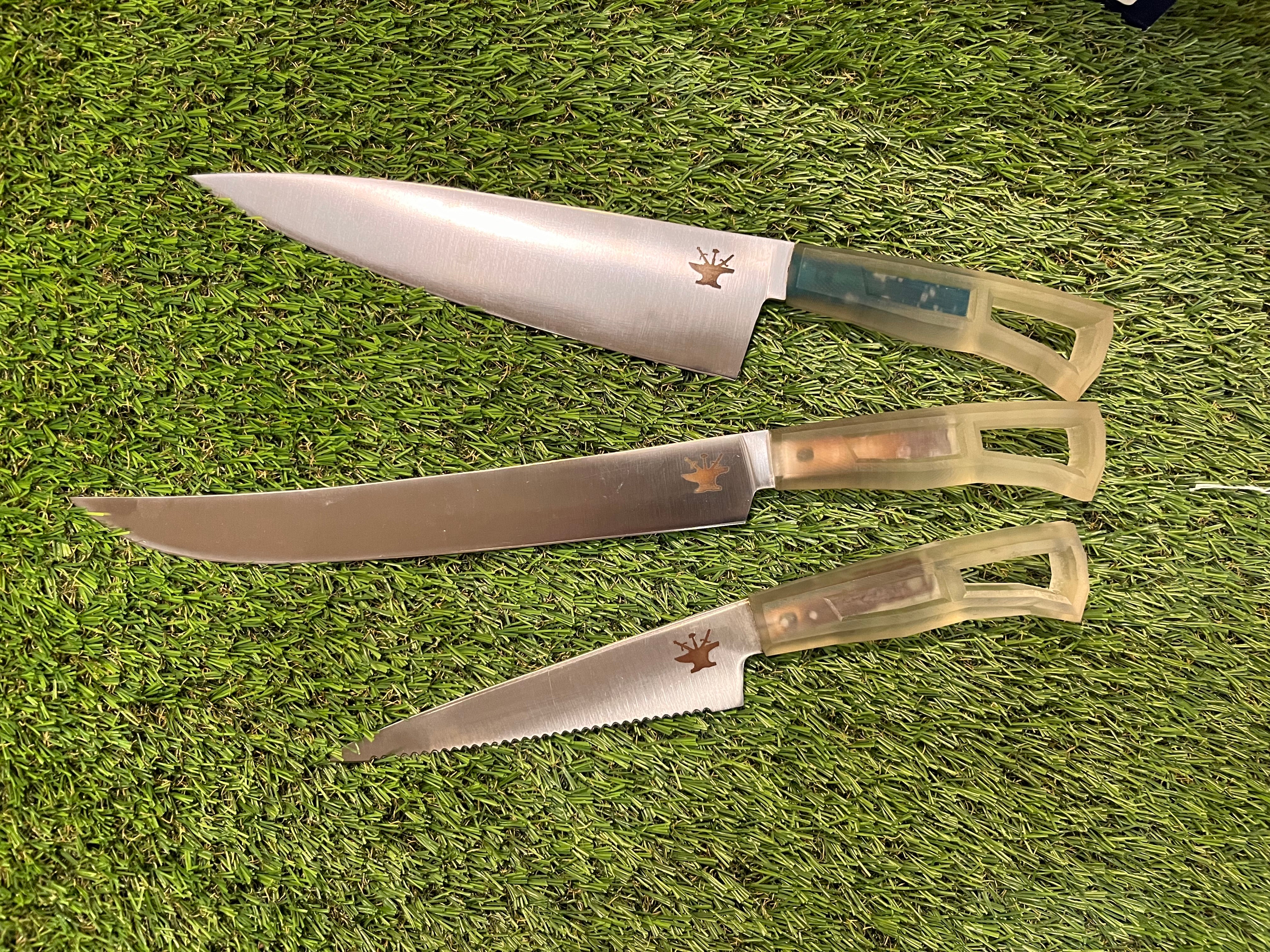 Ready to tackle any cooking challenge like a fearless chef with a Steel Kitchen Knife by Nazz Forge. Hand-forged for precision, this set includes a bread knife, chef's knife, slicing knife, and pairing knife. As seen on Forged in Fire, these knives are perfect for any adventure in the kitchen. Handle is made of ST-45 known in the field as “ICE”. This material is impact resistant and dishwasher safe.