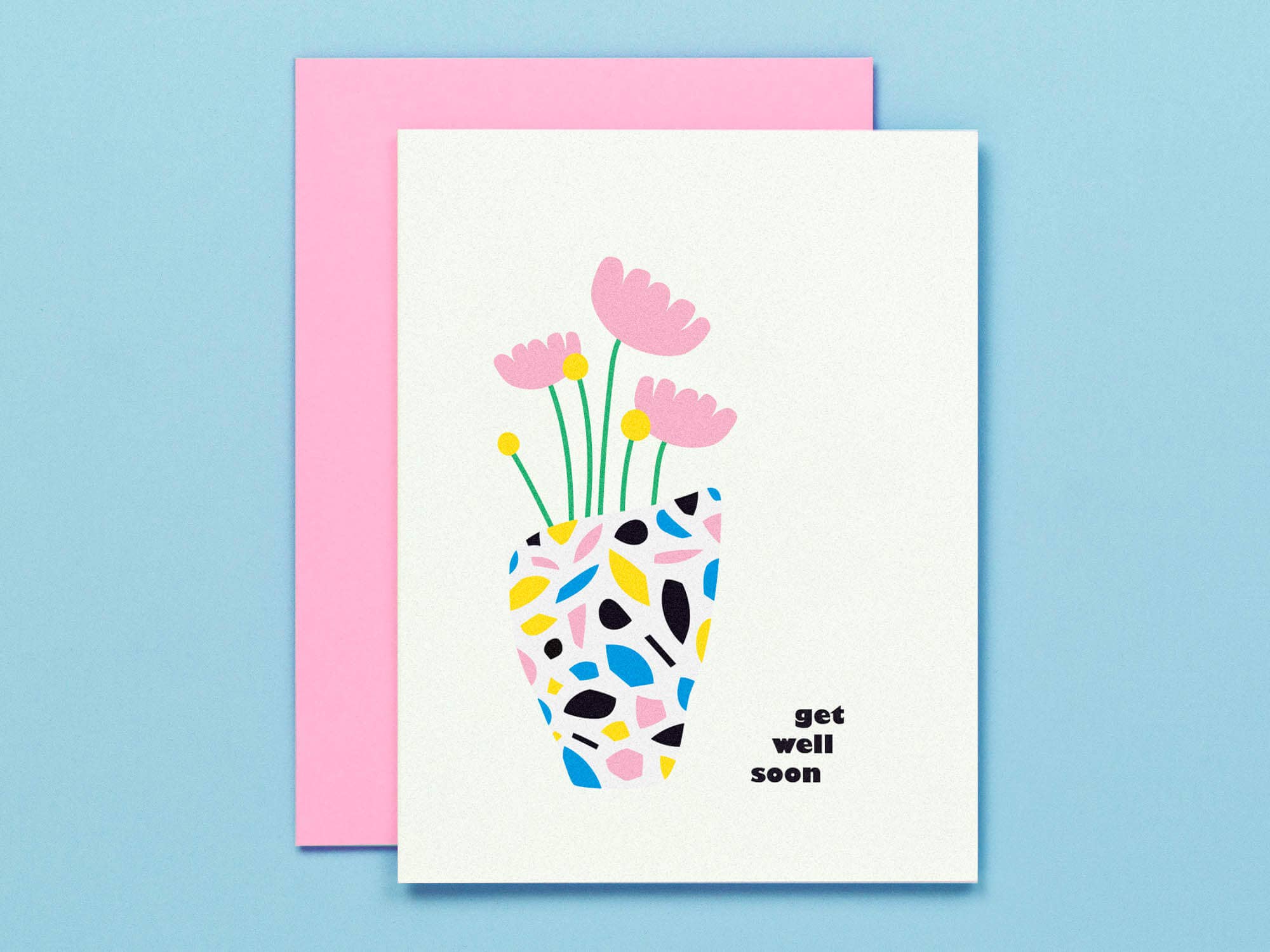 A get well soon card with a terrazzo vase of bright flowers and well wishes.