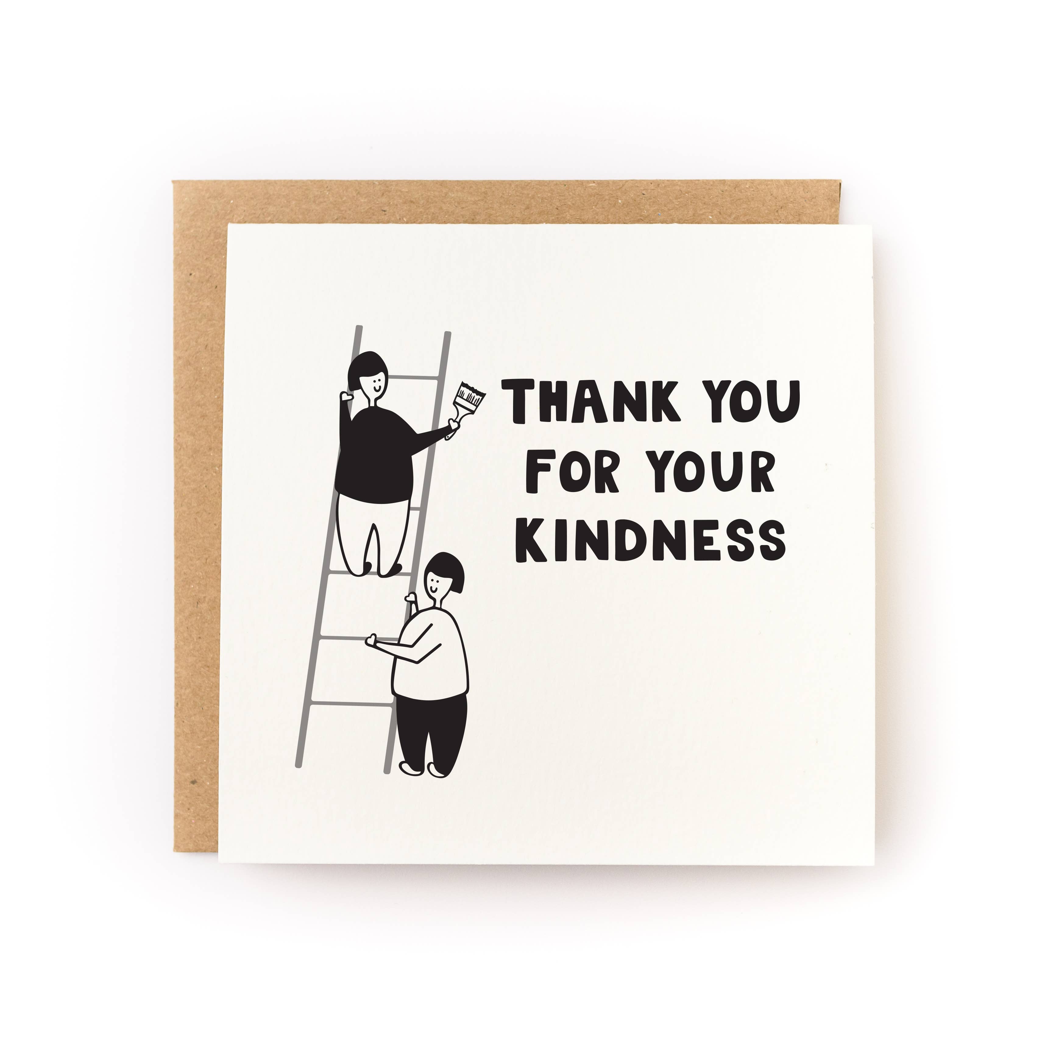 A simple and cute thank you card for someone who showed an extra bit of kindness. - 4.75" x 4.75" folded card - Blank inside - Letterpress printed by hand on an antique printing press in Brooklyn, NY - Printed on luxe soft white cardstock - Paired with a 5" recycled kraft envelope and open cello sleeve - Square envelopes require additional postage