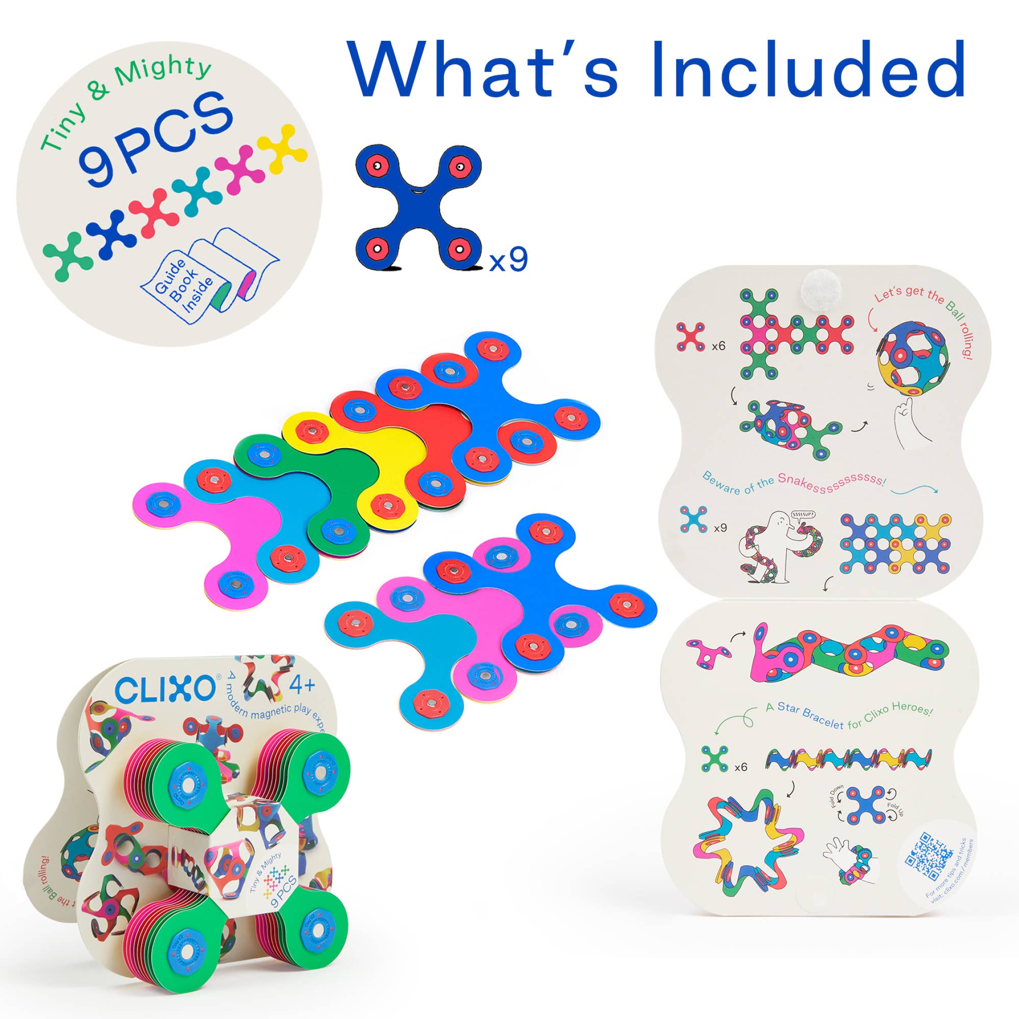 These 9 pieces of our signature Quad shape can make numerous clever creations. Whether you snap a snake, click a crown, roll a ball, or stack the shapes – a world of fun discoveries is in this pocket-sized-wonder pack!