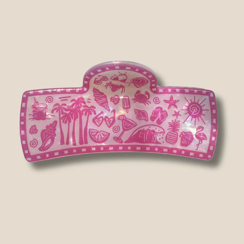 A beach day in a hair claw. This hair claw is made for sun-drenched afternoons, salty hair, and carefree summer nights. Whether you're strolling the boardwalk or dancing under neon lights, it’s the perfect pop of color for any adventure. Hot pink details with a pearlescent background. Lightweight and durable, it’s made for effortless styling.