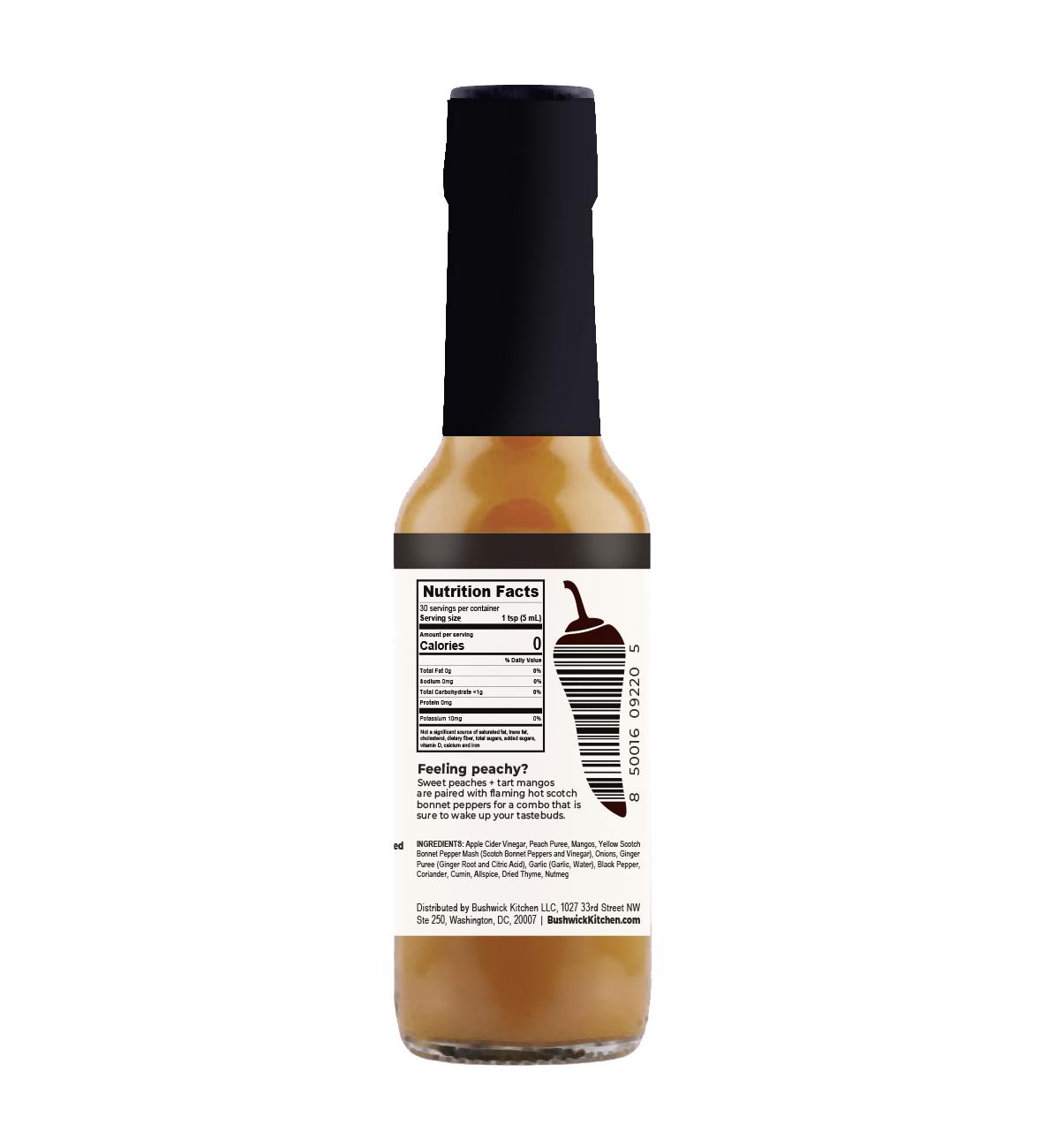 Feeling peachy? Sweet peaches + tart mangos are paired with flaming hot Scotch bonnet peppers for a combo that is sure to wake up your tastebuds. Customers exclaim that "A nice fruity heat that goes good on almost anything, this has become a new favorite and it's running out quick. The thickness is good, easy to dab on things without dribbling down the lip of the bottle." We have a perfect five star rating, over a 99% sell through rate, received over 22 culinary awards, and have sold over 900,000 bottles.